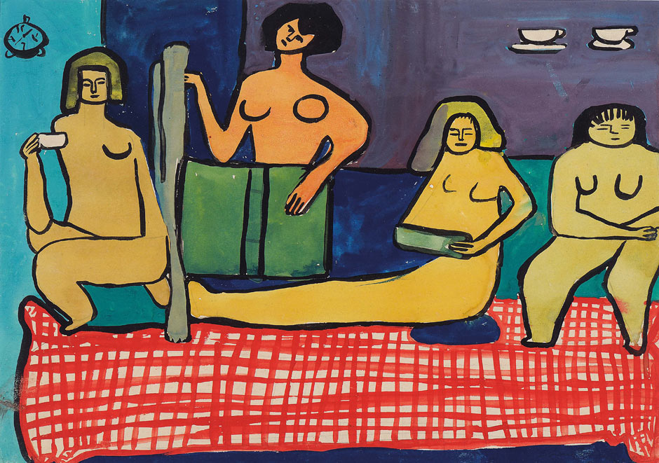In Choucair’s gouaches, the lines accentuate and stress the individuality, yet the whole composition refer to a more complex community of women and lives amongst women. Here the lines reflect movement, the drawings although nude are not really erotic, or purposefully appealing, they are just diverse women, with diverse bodies. It is possible to imagine them talking, or simply being in silent, enjoying the rare moments of solitude and privacy in both traditional and modern societies.Saloua Raouda presents three main images titled Les Paintres Celebres. This is one of them: