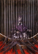 Bacon’s obsession with religion and authority appears intermittently in his paintings. The series of Crucifixions reveal the many ways in which the artist approached this classic theme. He was not attempting to re-create a religious message, nor he was interested in challenging it. For Bacon, the crucifixion can be understood as an act of violence; and it is related to his concern about the bestiality of human beings. He developed his crucifixions by focusing on the fleshy characteristics of the subject, as he asserted: “Well, of course, we are meat, we are potential carcasses. If I go into a butcher’s shop I always think it’s surprising that I wasn’t there instead of the animal’.[3] For many, the reference to the Crucifixion can be understood within a the context of the Second World War and the Holocaust. Notwithstanding, the first painting of the Crucifixion came from the earlier period of the painter, and it was this painting which put Bacon in the map of artists in Britain.[4].
