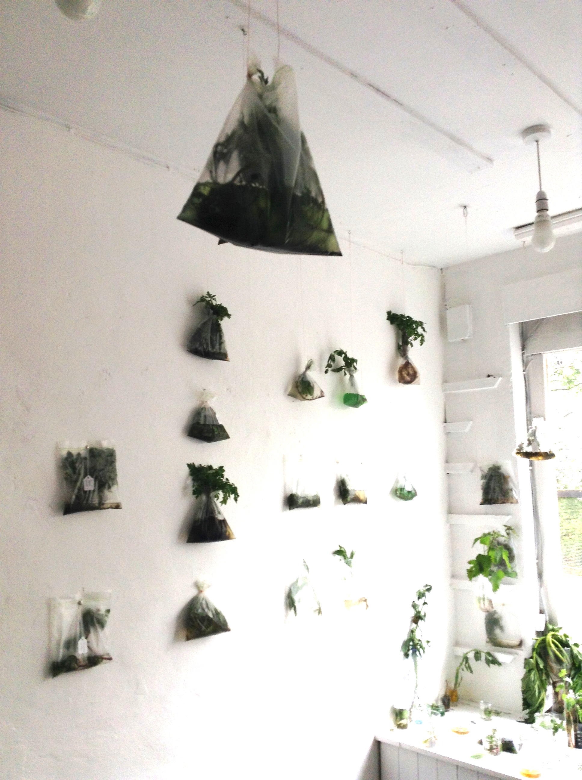 I stumbled by chance to this wonderful exhibition, and I found a plethora of inspiring interpretations of art. Starting with the installation/sculpture of Ariana Jordao & Suzie Olczak called “Suspended Animation.” An installation of several plastic bags containing specimens of plants floating in water, hanging from the ceiling: it makes you think about hydroponics, but also, botanical dynamics or hanging gardens, like in the Ancient Babylon…. one may even try to eat the specimens, as they are all edible plants… The idea is based on Ariana’s background as a scientist (before she joined the art world) and the way in which scientific knowledge create certain “views” of objects and Susie Olczak’s interest in how viewers experience space, form and light. The combination of these two talents make me think in two levels: one when a plant become an specimen (these are all edible weeds freely available) or an art piece, and secondly, the way in which we consider gardening. It also made me think about the “gaze” created in the art gallery, something that differ of the scientific gaze organised in the laboratory or the clinic, and the ‘rambler’ gaze, walking through fields and hills. All of them come across the same object, the same plant, yet the meanings are differently constructed. In this work, I love the fact that the floating plants were delicate and fragile, yet, attainable, like jewels or scientific data (so precious) as the earth herself.