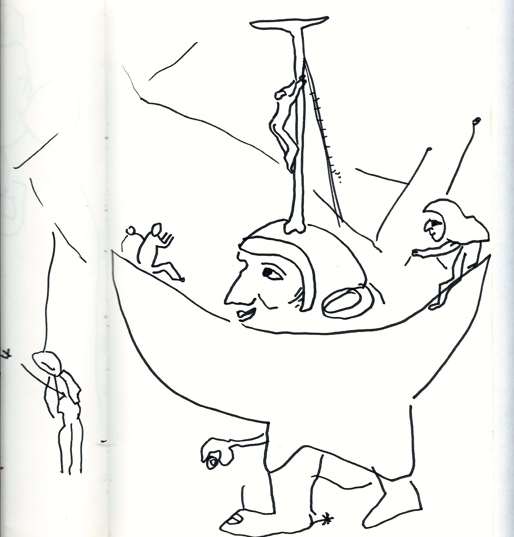 Other contemporaries of Bosch also represented this technique in the treatment of madness, also pointing the “madness” of both treatment and patients. I made some drawings from the fantastic and unique exhibition of Hyeronimous Bosch in the Rotterdam Museum in 2002: