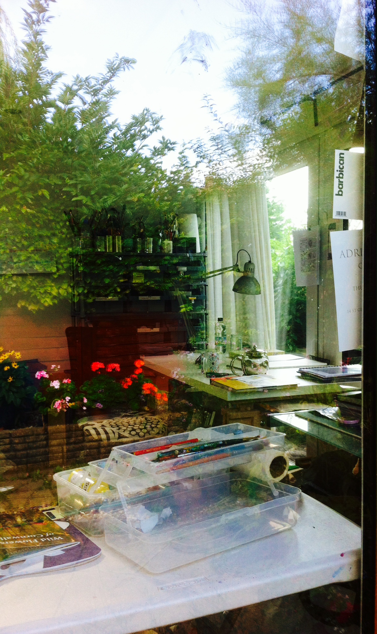 I spent most of last year’s summer (2013) preparing for that. I was on sick leave due to stress, so the garden was a good way to get back on my feet, and cleaning the space for the studio, became a fantastic therapy to “de-clutter” my own mental space. We chose an area of the garden which once was populated by a lovely meadow and a small green house, but due to unforeseen circumstances it became a bit of “dump”: the weeds had invaded what it was a lovely circle of stone, the green house was home for many spiders (and other creatures) nesting in the old pots, and all sort of detritus was deposited there. When we were clearing to make room for the studio which involved weeding and revealing walls and slates covered under an English jungle (I never thought weeds to be so savage!); clearing spaces, opening the path obstructed by overgrown branches; rehabilitating the garden shed (a lick of paint and tidy up), and most interestingly, discovering gardening. This has been one of the best things in my life, and also it has fed my love for botanical drawings: you can see the results in the ongoing series of “Our Garden of Everyday”
