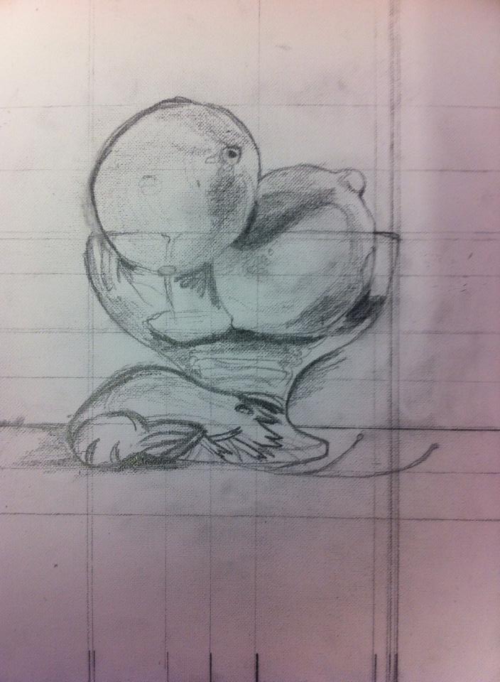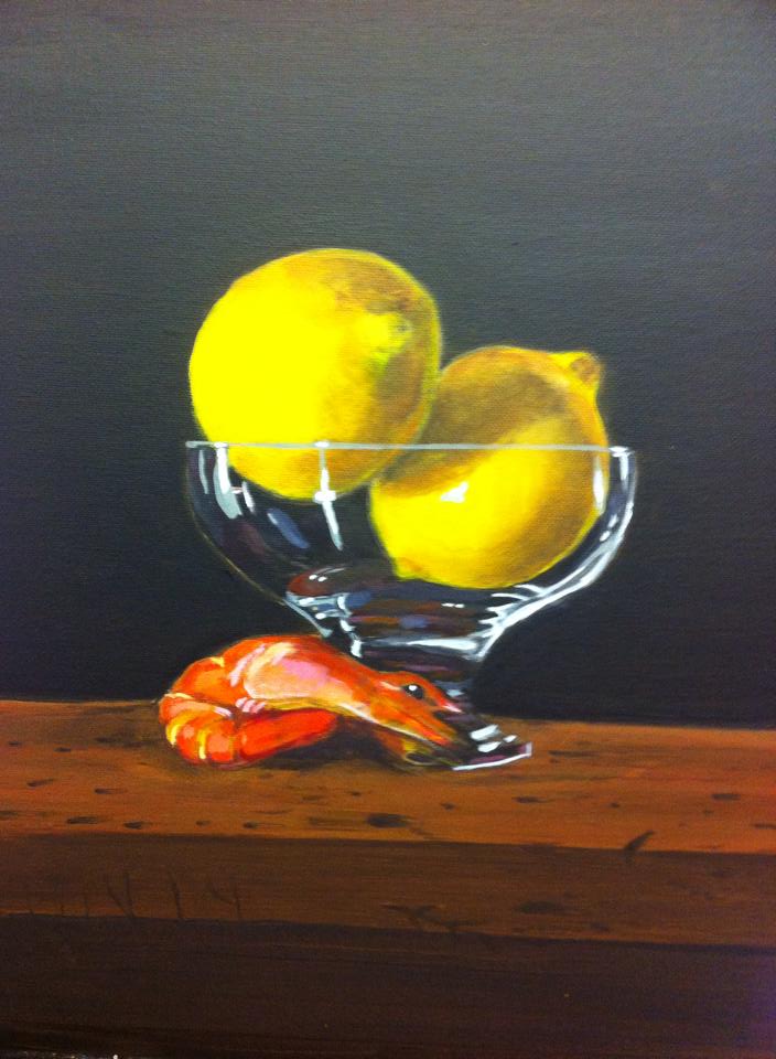 Firstly, the sketching which basically needs to place objects in the space and perhaps identify some shades and lights, then the process of coloring and getting shapes and shadows in place by using acrylics, this is a precise process in which even the glass is painted. Finally some good layers of oil painting defining the contours, brightening the light in the glass surfaces, giving body and depth to the lemons, polishing the wood and adding texture and definition to the background. I was very pleased with my prawn and lemons and although it is not finished yet, it looks pretty good!