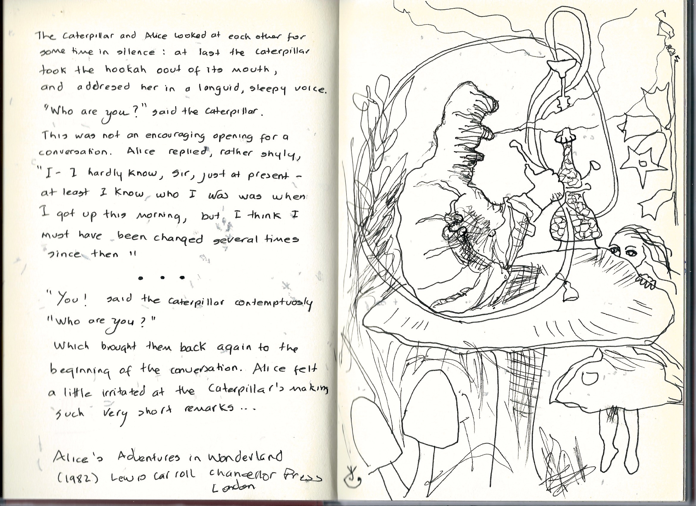 “The caterpillar and Alice looked at each other for some time in silence: at last the Caterpillar took the hookah out of its mouth, and addressed her in a languid, sleepy voice. “Who are you?” said the Caterpillar. This was not an encouraging opening for a conversation. Alice replied, rather shyly” “I-I hardly know, Sir, just at present -at least I know who I was when I got up this morning, but I think I must have changed several times since then.”