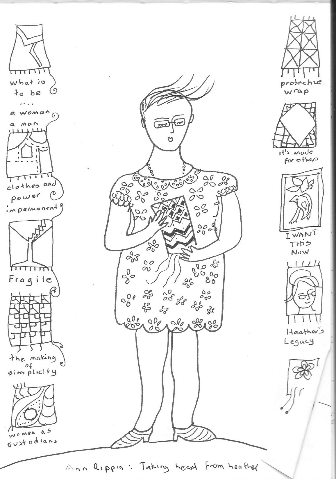The second presentation could not be more daring and loyal to Heather’s pledge: “Find your voice, whatever daring, whatever “crazy”, bring out your voice…” and Ann Rippin, who I have several times quoted in this blog, brought a three threads text-tale based on her almost 30 years work with quilting. The three threads are firstly, the first voice is people’s interviewed by Ann through the quilting process (is this quilt-elicitation?)… the second voice, is a groundbreaking book about cloth as historical archive (I will find the exact reference); and the third voice, is Ann’s own reflection, response and reaction to those voices. I must confess I was completely confused at the beginning, I was expecting the normal charismatic performance – the DivAcademic or the EduTainer – so when she started “reading” I was not really prepared… soon I decided to relax and just enjoying the textures of voices, the chorus produced by the threads, and it was so interesting, moving, profound and well based on whatever theoretical/conceptual framework you want! And as she is an academic quilter, my drawings reflect that…