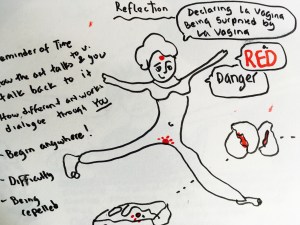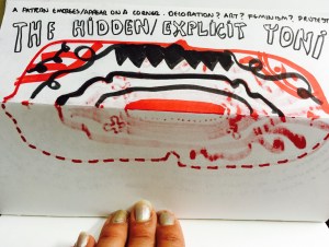 We were encouraged to perambulate and choose a work of art, either because it was intriguing, or rather because it repels us. I was intrigued by a drawing directly stenciled on a wall corner. It looked high like a number eight, with arabescos surrounding a sort of hole… This was the No Titled by Richard Wright which reminded me of the Yonis. I have been obsessed with the Yonis ever from my return from Colombia. It is strange fascination mixing the impressions of my Mother Land, with some more current concerns about rape and the female body as a space for disciplining, war, terrorism and violence. So there I was, just contemplating the work and translating it into my drawings.