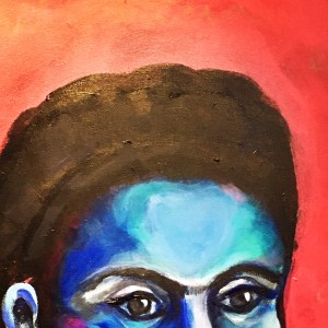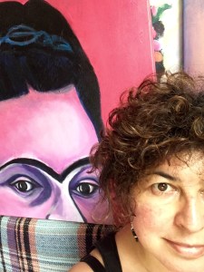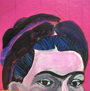 The result is a large representation of Frida that looks directly at the viewer! There is nothing else but her gaze…. I felt that was what I wanted all the time! This Frida is there to advice you, to let you know what to do. It has the quality of an Aztec goddess, but with a more Western approach, in which the face and the gaze operate the miracle. I thought also that in Mexican culture there is a huge devotion to saints, as Frida herself represented by her appropriation of the “ex-votos“. These ex-v0tos are raw, naif, simple representations of miracles and are painted in tin or wood, and placed around the saints in gratitude. In this painting, I wanted also to work on the gratitude, but also on the consultation part. I normally use a lot of little images, and indeed I did in the layers prior to the final result: I painted flowers, then I painted over them with spots, then I decided to write some fragments of Frida’s journal, then I decided to paste flowers, and at the end I decided to paint all in a deep pink coral hue and start again, this time focusing on her gaze and her hair, the constitutive elements of her iconography. I got through a number of paintings in search of the gaze. In fact, my representation is not based on a single painting but in a collection of them: I started with a griselle of hair and eyes in acrylics, and once i was happy with the result, I applied delicate layers of oil painting, one glaze after the other, leaving enough time to dry and glaze again. The result is a deep, layered and meaningful painting, with the beautiful shine of oil paint. I am happy… she is gazing at the viewer, who can ask for advice: “Frida, what would you do?”