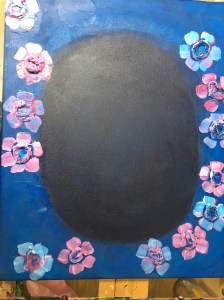 For the second painting I had high expectations, which proved fatal! I wanted to do a Frida that reflected her Indigenous heritage, I wanted an Aztec godess, an Icon, an image of power. I had so many ideas that when I went to execute them, they failed me. I had so much invested in the painting, but the images came horribly! I wanted to dump the canvas, but, following Michael Atavar advice, I decided to go on. In fact, the penny dropped when I asked myself: “what is the worst that can happen if I do not complete these Fridas?” Well, I would have to cancelled my participation in the show, but this was not going to be the end of the world or terrible because this is a collective exhibition… so I realised that I had nothing to lose and decided to let it flow, play and experiment. Not that this worked better: the Fridas were not what I wanted, but I was less stressed, and somehow detached, as my ego was not really interested. One night I had the most intriguing dream: In the dream i was having to face a difficulty, which was something physical, like a wall… my inner voice said, push through that wall as much as you can, because there is “light” at the other side… I pushed through and yes, there was a solution! I was amazed by this all, and I thought this can be applied for my life, and for my painting, why not? I thought what if I have to distill what Frida is, what would I get? Perhaps it is her eyes, her characteristic eyebrows, her hair combed with flowers… and there it was, I repainted again and fill it with more materials to make it textured, and just focused on those essential elements.