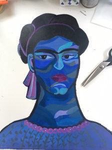 The contradiction reached an unexpected climax: when I picked the painting from the storing place to get it ready, I saw with horror that it had a tear on the left corner… something irreparable: A Broken Frida!!!! I was in shock, what to do next? Initially, I tried to “replicate” her, after all I had painted it once. But soon, I learned that it is impossible to do the same painting twice: the colours were different, and indeed my mood has changed. I thought of making a print of it and paint it over, but I did not like that either, it would be to mechanistic. At the end, I accepted that there was not so much to do, only to experiment and push the problem to its last consequences, and I think this is what Frida would do: I decided to remake the frame/background, with similar flowers but in mixed media, making it more dramatic and exaggerated. It was like a shrine, with different layers of painting, tissue paper and collage, and I painted over and over again to get a rich and tactile texture. And then, at the very end, I performed the main surgery: I dedicated a whole day for this delicate operation. Using pinking scissors (to avoid fraying) I cut the silhouette of Frida and I laid her on the new frame. I fastened it with silk pins to avoid damage and once it was in place, I stitched her patiently.