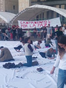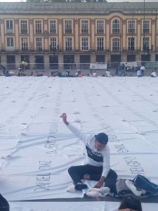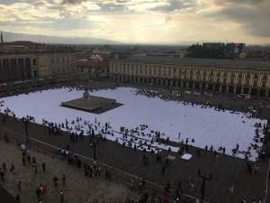 So what now? In spite of the referendum result, the apparent triumph of the NO campaign, still it is not very clear what is going to happen. The most interesting thing is the activation of so many social movements and responses: the student movement assuming a political role; the influence of churches and evangelic groups also invited to dialogue; the convergence of campesino victims (3000) and indigenous groups (7000) “walking” to Bogota, meeting in the Plaza de Bolivar (the main Square next to the President House), in order to make their presence felt. And the power of the Nobel Prize, as an international symbol supporting the Peace Conversations. And once again, art and Doris Salcedo, reminds us that the Peace Agreement was not about FARC and Government, or Left vs. Right, or political participation per se, but the beauty of the Peace Agreement is about their focus on the victims of the conflict, the land reform, and the importance of offering economic opportunities for those affected by the violence to rebuild their future. Because then, in the middle of this conflagration of forces, people camping in the Plaza de Bolivar the marches in the streets, the candles and the music, the artist invited people to “weave” memories of the victims of the conflict in her work: Sumando Ausencias. Using white fabric, the artist and many collaborators wrote the names of 1900 victims of the conflict using ashes as charcoal. She invited people from all over the city to participate in this act of mourning and reconstruction: many sew the white rectangles of those cherished names, covering the almost 14.000 square meters of this symbolic space of the city. After the power of this participatory installation, the city had a brief white pause, a silence to remember that beyond the political discussions, the different bands, the old and emerging powers, this Peace is for those victims, those forgotten, silenced, invisible people who are still claiming for a solution.
