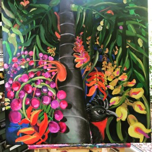 After this I decided to go to the bigger painting (80*80 cm) which has been transformed from the first version to what is now happening. The first version was taken as if I was looking the palm in front of me at the same height… but after going to Colombia I realised that one looks at the palms from below, so they curve up in the air. That was an epiphany as it provides the element of depth and a 3D approach to the painting… I was so happy!
