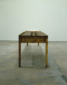 Continuing her questioning of violent acts Doris Salcedo developed ‘Unland’ (1998). Unland is a created word, aiming to describe the situation of being ‘displaced’ from a territory, of being in no-land, invisible, forgotten, wandering across the country: a common consequence of the conflict in Colombia. During a period of three years Salcedo spoke to children in orphanages and isolated towns in Colombia who had witnessed the murder of their parents. She collected pieces of furniture: tables, chairs, wardrobes, trying to extract their meaning in what once could have been a family, a house or a home. By assembling odd parts, by breaking the legs of an old table, or by weaving human hair or bone on these objects, the artist manages to show the distortions created by the violent acts and their impact in the life of these children (Barson, 2004).
