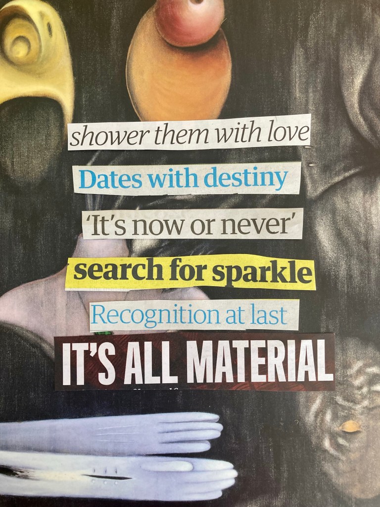So the creative oracle homework today is to have a diary of “materials” . Just keep your eyes and ears alert, everything counts. Keep your diary and take notes. A tip for this is “do not judge”, this is to stop your inner judge/editor from disposing of what could be a good morsel, just because at first it looks I significant or even silly. The purpose is to gather material: phrases, images, our own feelings, conversations, everything counts!